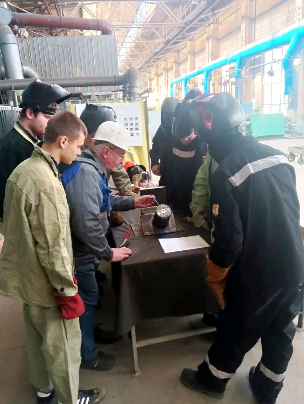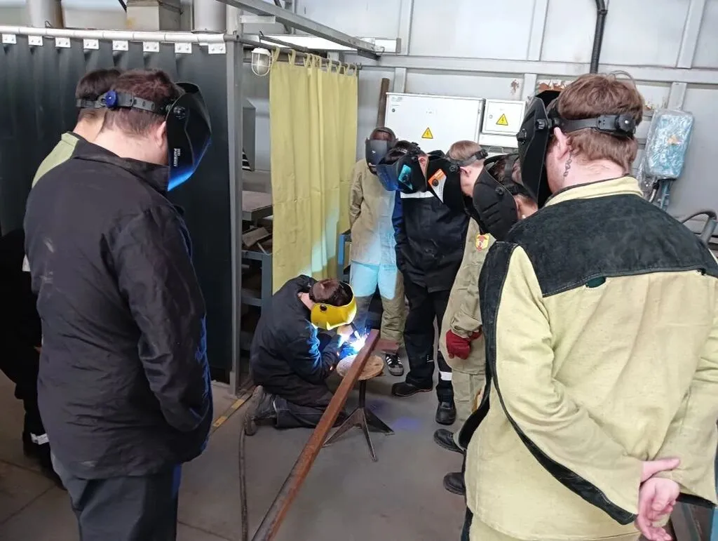 Группа слушателей, обучающихся по программе профессионального обучения по профессии Сварщик ручной дуговой сварки плавящимся покрытым электродом по реализации программы предоставления гранта в форме субсидии из федерального бюджета на финансовое обеспечение реализации мероприятий по предоставлению грантов на обучение по основным программам профессионального обучения на бесплатной основе участников студенческих отрядов по профессиям рабочих, должностям служащих, необходимым для осуществления трудовой деятельности в составе таких отрядов выполняет практические занятия по профессии.